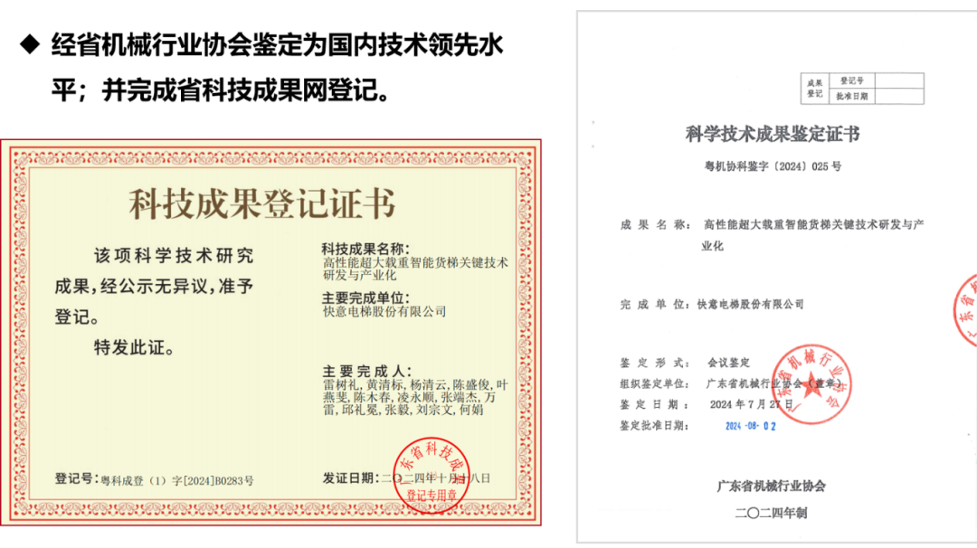 快意電梯憑借“高性能超大載重智能貨梯關鍵技術研發與產業化”項目,成功摘得創新東莞科技進步獎。該項目直面智慧物流與高端制造對垂直運輸的極限需求,攻克了超大型轎廂結構設計、智能群控調度算法等核心難題。目前,該成果已廣泛應用于多個大型物流樞紐與工業場景,為快意電梯在市場上提供了更安全、高效、節能的智能垂直運輸解決方案,顯著提升貨物轉運效率。